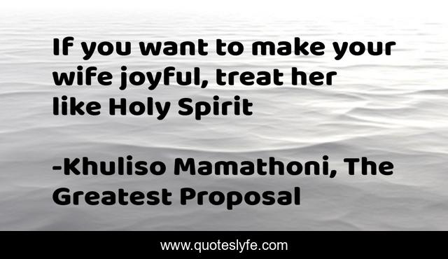 This page presents the quote "If you want to make your wife joyful, treat her like Holy Spirit". Author of this quote is Khuliso Mamathoni, The Greatest Proposal. This quote is about love, marriage, relationship, affection,.