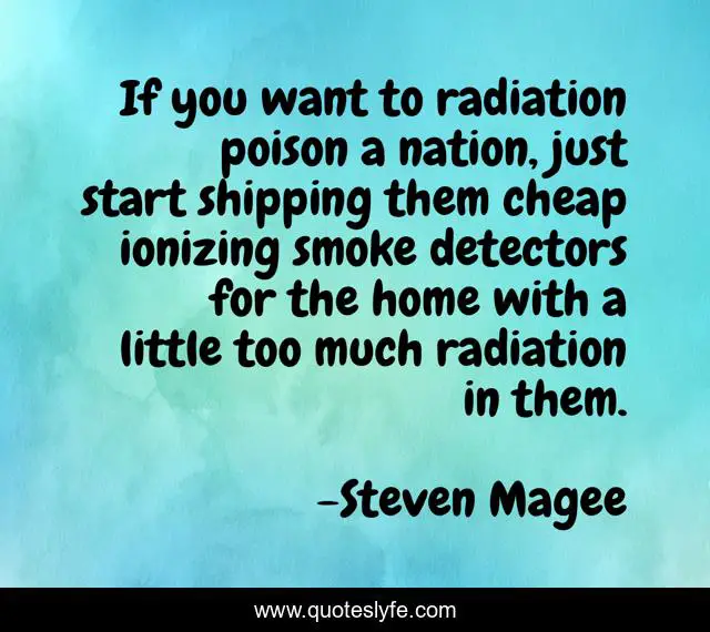 This page presents the quote "If you want to radiation poison a nation, just start shipping them cheap ionizing smoke detectors for the home with a little too much radiation in them.". Author of this quote is Steven Magee. This quote is about ionizing, detectors, cheap, poison, nation, much, shipping, smoke, radiation-effects,.