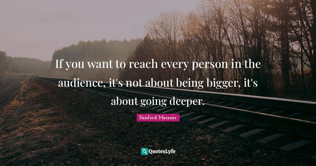 This page presents the quote "If you want to reach every person in the audience, it's not about being bigger, it's about going deeper.". Author of this quote is Sanford Meisner. This quote is about audience, bigger, deeper,.