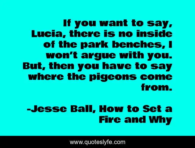 This page presents the quote "If you want to say, Lucia, there is no inside of the park benches, I won’t argue with you. But, then you have to say where the pigeons come from.". Author of this quote is Jesse Ball, How to Set a Fire and Why. This quote is about funny, comedy, funny-and-random,.