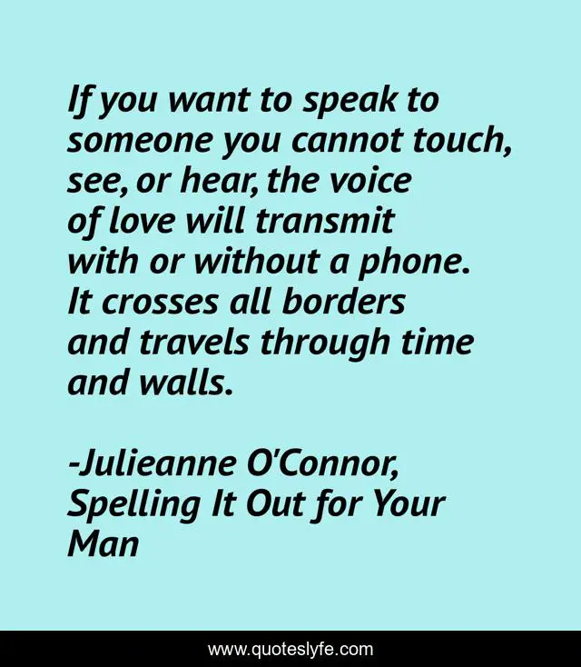 This page presents the quote "If you want to speak to someone you cannot touch, see, or hear, the voice of love will transmit with or without a phone. It crosses all borders and travels through time and walls.". Author of this quote is Julieanne O'Connor, Spelling It Out for Your Man. This quote is about relationships, faith, life, love, inspirational, joy, satisfaction, happiness, truth,.