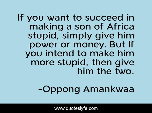 This page presents the quote "If you want to succeed in making a son of Africa stupid, simply give him power or money. But If you intend to make him more stupid, then give him the two.". Author of this quote is Oppong Amankwaa. This quote is about money-and-stupidity, power,.
