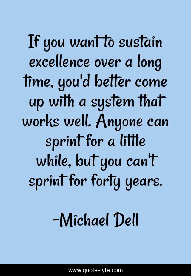 This page presents the quote "If you want to sustain excellence over a long time, you'd better come up with a system that works well. Anyone can sprint for a little while, but you can't sprint for forty years.". Author of this quote is Michael Dell. .