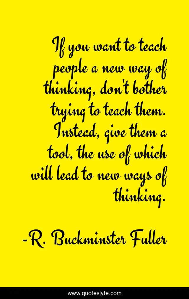 This page presents the quote "If you want to teach people a new way of thinking, don't bother trying to teach them. Instead, give them a tool, the use of which will lead to new ways of thinking.". Author of this quote is R. Buckminster Fuller. This quote is about training, thinking, tool, learning, learn, teaching, teach, think,.