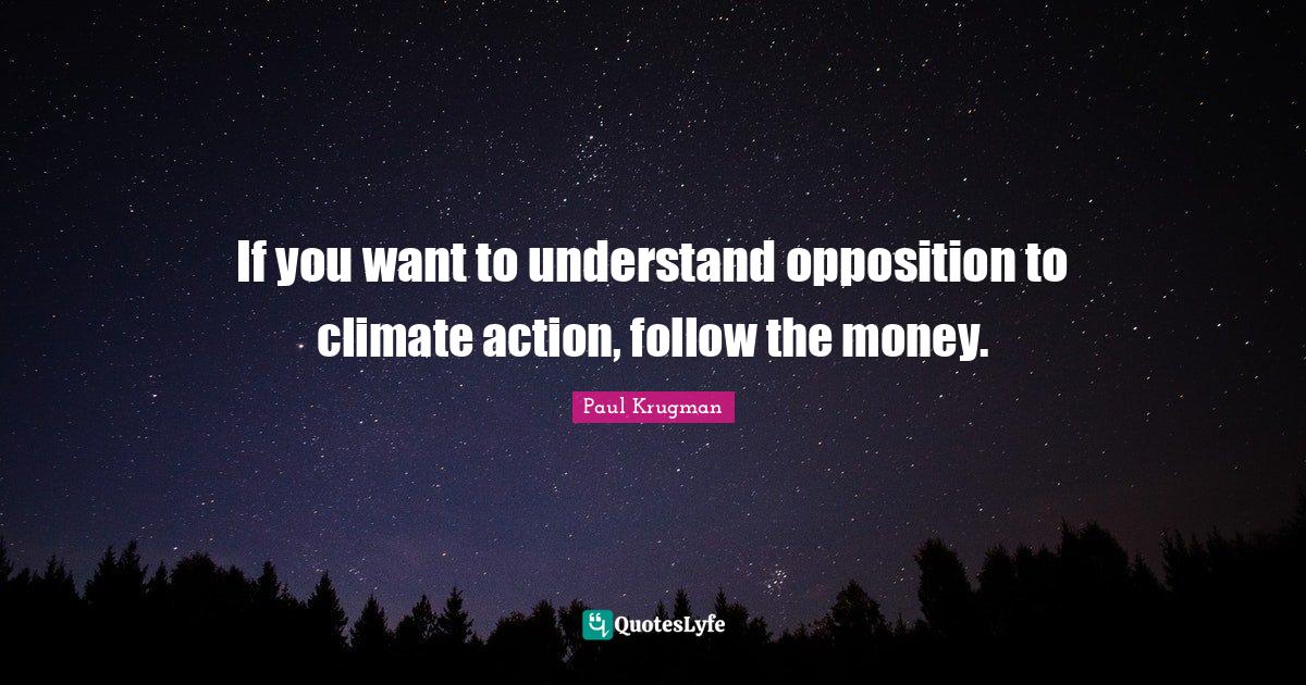 This page presents the quote "If you want to understand opposition to climate action, follow the money.". Author of this quote is Paul Krugman. This quote is about climate action, money, global warming, opposition,.