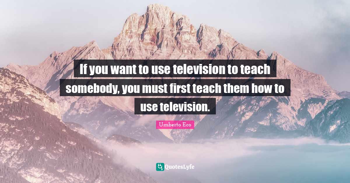This page presents the quote "If you want to use television to teach somebody, you must first teach them how to use television.". Author of this quote is Umberto Eco. This quote is about teach, television, use,.