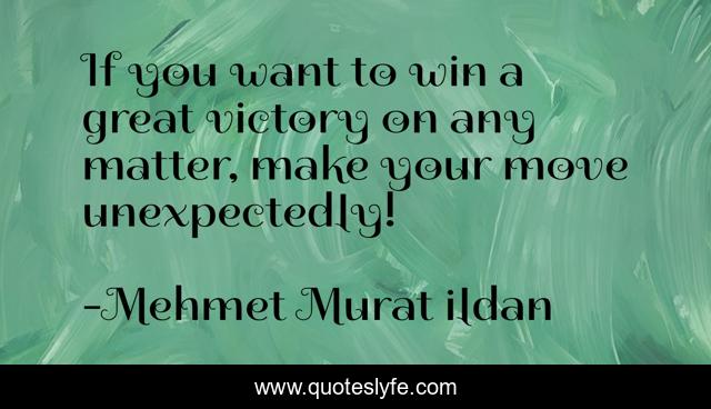 This page presents the quote "If you want to win a great victory on any matter, make your move unexpectedly!". Author of this quote is Mehmet Murat ildan. This quote is about turkish-aphorisms, turkish-wisdom-words, unexpected, mehmet-murat-ildan, ildan-wise-sayings, turkish, ildan-wisdom, turkish-playwrights, turkish-sayings,.