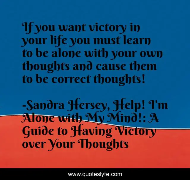 This page presents the quote "If you want victory in your life you must learn to be alone with your own thoughts and cause them to be correct thoughts!". Author of this quote is Sandra Hersey, Help! I'm Alone with My Mind!: A Guide to Having Victory over Your Thoughts. This quote is about breakthrough, victory, thoughts,.