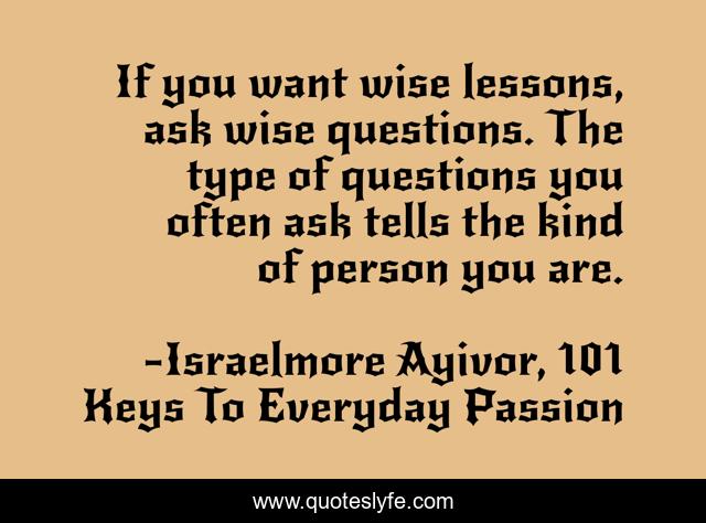 This page presents the quote "If you want wise lessons, ask wise questions. The type of questions you often ask tells the kind of person you are.". Author of this quote is Israelmore Ayivor, 101 Keys To Everyday Passion. This quote is about lessons, good-question, food-for-thought, wise, everyday-passion, ask, israelmore-ayivor, lesson, wise-lessons,.
