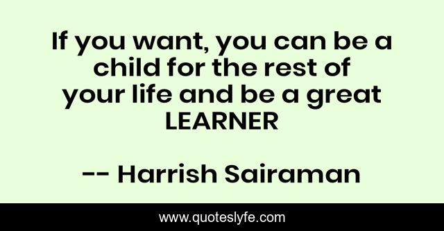 This page presents the quote "If you want, you can be a child for the rest of your life and be a great LEARNER". Author of this quote is - Harrish Sairaman. This quote is about great, positive, motivational, learner, confidence, quotes, optimistic, inspirational, child,.