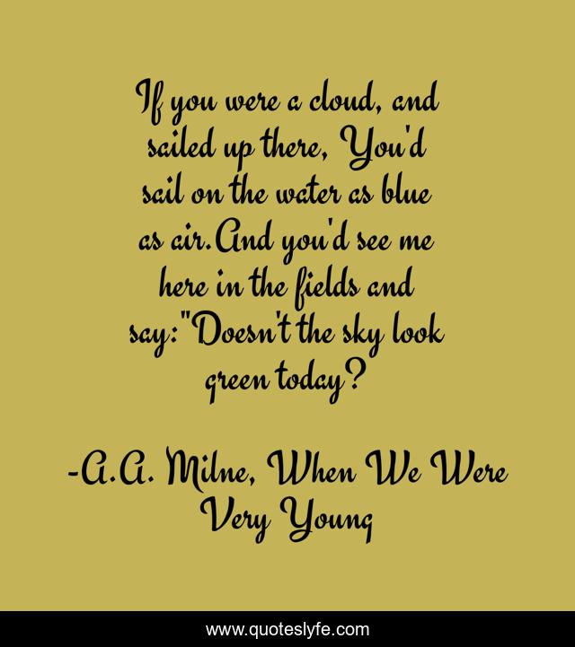 This page presents the quote "If you were a cloud, and sailed up there, You'd sail on the water as blue as air.And you'd see me here in the fields and say:"Doesn't the sky look green today?". Author of this quote is A.A. Milne, When We Were Very Young. .