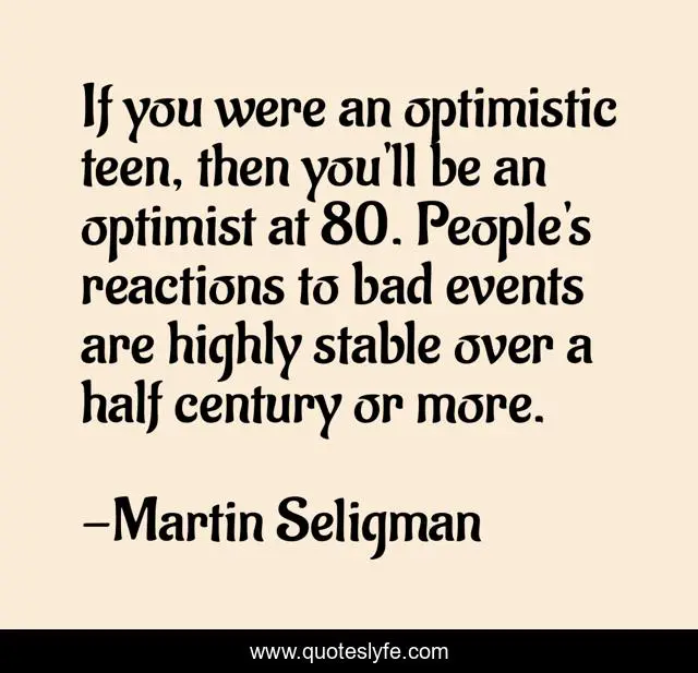 This page presents the quote "If you were an optimistic teen, then you'll be an optimist at 80. People's reactions to bad events are highly stable over a half century or more.". Author of this quote is Martin Seligman. This quote is about bad, people,.