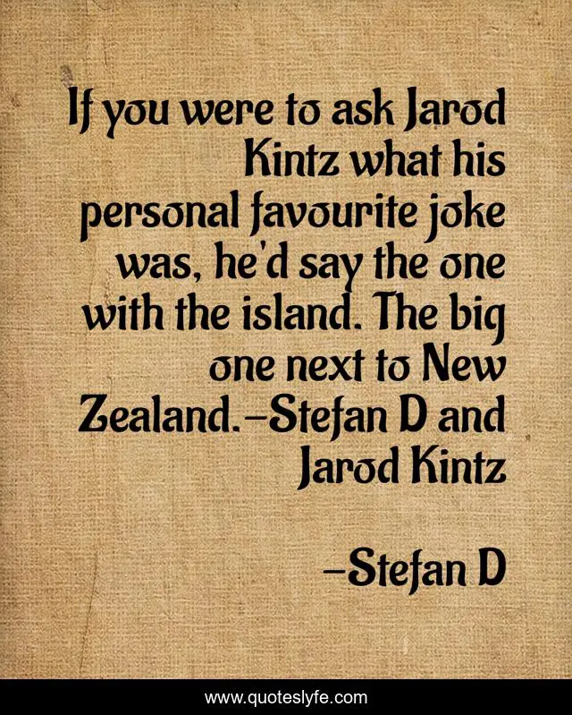 This page presents the quote "If you were to ask Jarod Kintz what his personal favourite joke was, he'd say the one with the island. The big one next to New Zealand.-Stefan D and Jarod Kintz". Author of this quote is Stefan D. This quote is about favourite, island, favorite, jarod-kintz, joke, best,.