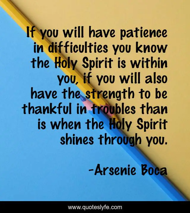 This page presents the quote "If you will have patience in difficulties you know the Holy Spirit is within you, if you will also have the strength to be thankful in troubles than is when the Holy Spirit shines through you.". Author of this quote is Arsenie Boca. This quote is about spirituality, holy-spirit, eastern-orthodoxy, inspirational, enthusiasm,.