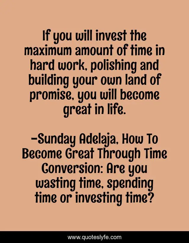 This page presents the quote "If you will invest the maximum amount of time in hard work, polishing and building your own land of promise, you will become great in life.". Author of this quote is Sunday Adelaja, How To Become Great Through Time Conversion: Are you wasting time, spending time or investing time?. This quote is about life, promise, investment, conversion, productivity, wealth, hard-work, time-investment, greatness,.
