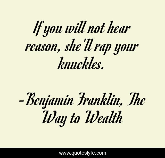 This page presents the quote "If you will not hear reason, she'll rap your knuckles.". Author of this quote is Benjamin Franklin, The Way to Wealth. .