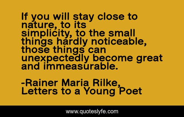 This page presents the quote "If you will stay close to nature, to its simplicity, to the small things hardly noticeable, those things can unexpectedly become great and immeasurable.". Author of this quote is Rainer Maria Rilke, Letters to a Young Poet. This quote is about simplicity, nature,.