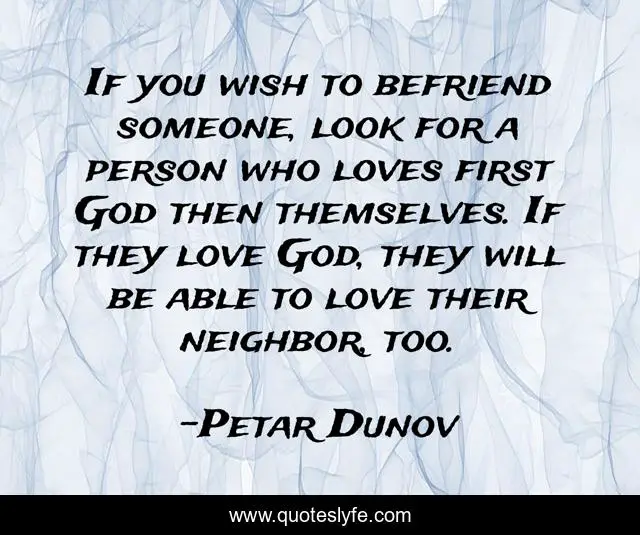 This page presents the quote "If you wish to befriend someone, look for a person who loves first God then themselves. If they love God, they will be able to love their neighbor, too.". Author of this quote is Petar Dunov. This quote is about befriend, love, god, neighbor, friendship, affection,.