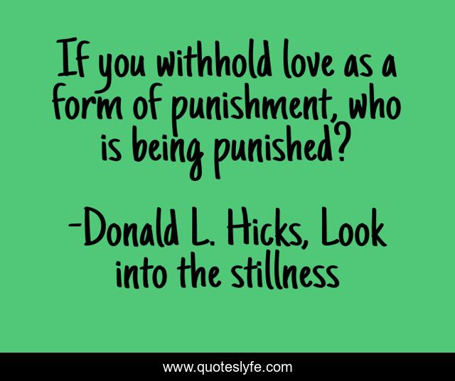 This page presents the quote "If you withhold love as a form of punishment, who is being punished?". Author of this quote is Donald L. Hicks, Look into the stillness. This quote is about grudges, judgement, cold-shoulder, withholding, judgemental,.