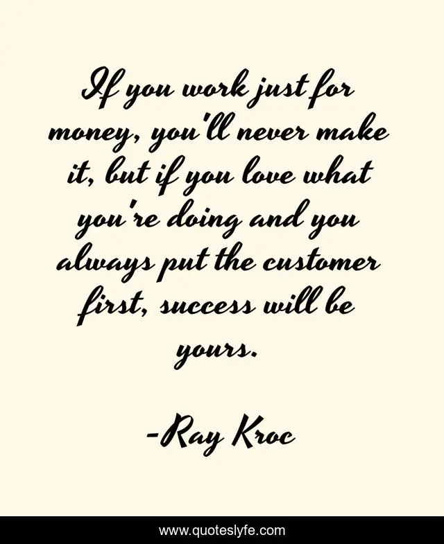 This page presents the quote "If you work just for money, you'll never make it, but if you love what you're doing and you always put the customer first, success will be yours.". Author of this quote is Ray Kroc. This quote is about money, love, success, affection,.