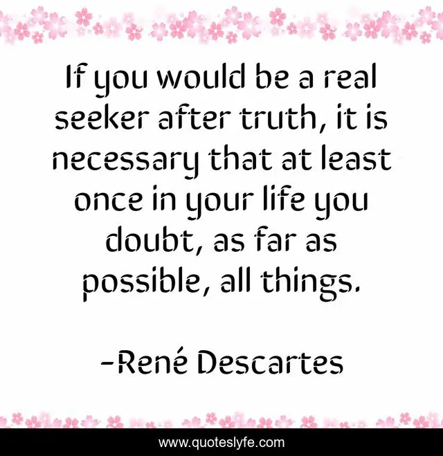 This page presents the quote "If you would be a real seeker after truth, it is necessary that at least once in your life you doubt, as far as possible, all things.". Author of this quote is René Descartes. This quote is about doubt, truth,.