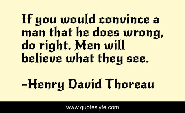 This page presents the quote "If you would convince a man that he does wrong, do right. Men will believe what they see.". Author of this quote is Henry David Thoreau. This quote is about believe, man,.