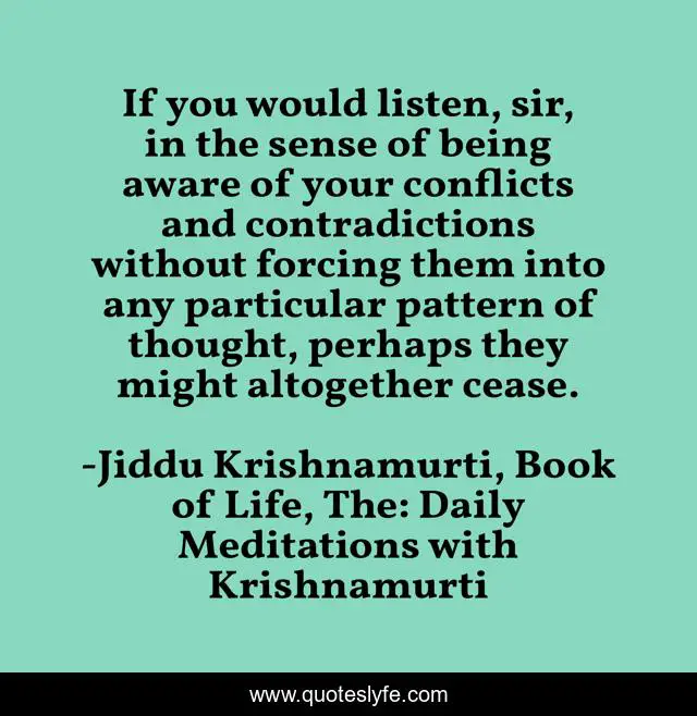 This page presents the quote "If you would listen, sir, in the sense of being aware of your conflicts and contradictions without forcing them into any particular pattern of thought, perhaps they might altogether cease.". Author of this quote is Jiddu Krishnamurti, Book of Life, The: Daily Meditations with Krishnamurti. .