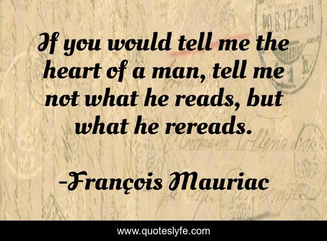 This page presents the quote "If you would tell me the heart of a man, tell me not what he reads, but what he rereads.". Author of this quote is François Mauriac. This quote is about books, reading, literacy,.