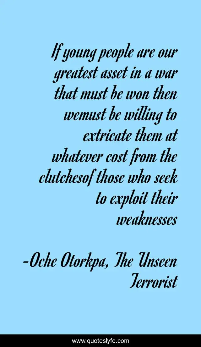This page presents the quote "If young people are our greatest asset in a war that must be won then wemust be willing to extricate them at whatever cost from the clutchesof those who seek to exploit their weaknesses". Author of this quote is Oche Otorkpa, The Unseen Terrorist. This quote is about young-people, weakness, youths, youth, won, teenager, teens, war,.
