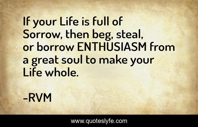 This page presents the quote "If your Life is full of Sorrow, then beg, steal, or borrow ENTHUSIASM from a great soul to make your Life whole.". Author of this quote is RVM. This quote is about motivation, inspiration,.
