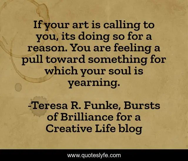 This page presents the quote "If your art is calling to you, its doing so for a reason. You are feeling a pull toward something for which your soul is yearning.". Author of this quote is Teresa R. Funke, Bursts of Brilliance for a Creative Life blog. This quote is about art, soul-searching, brilliance, yearning, passion, fortune,.