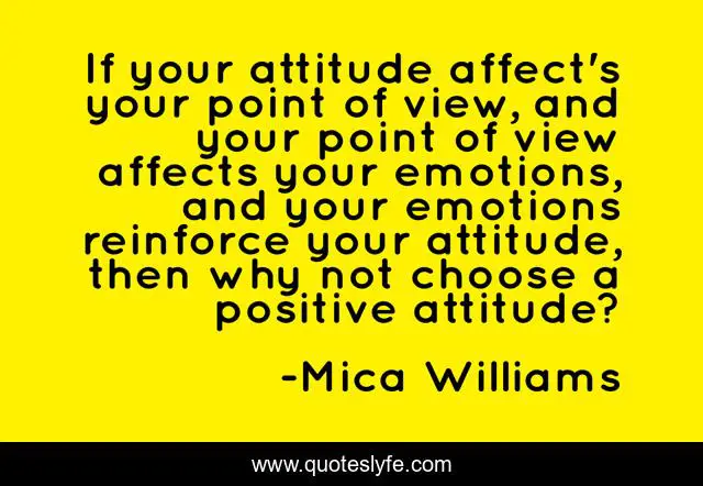 This page presents the quote "If your attitude affect's your point of view, and your point of view affects your emotions, and your emotions reinforce your attitude, then why not choose a positive attitude?". Author of this quote is Mica Williams. This quote is about behaviour, attitude, positivity-happiness,.