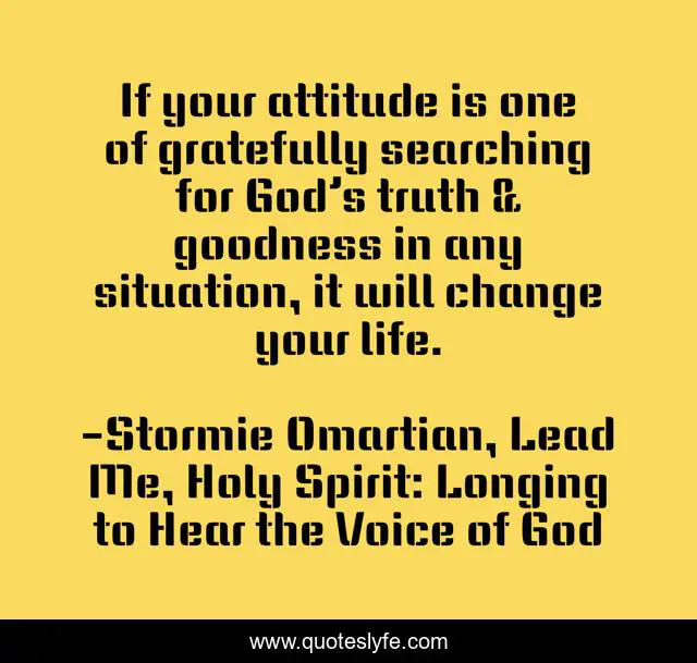 This page presents the quote "If your attitude is one of gratefully searching for God’s truth & goodness in any situation, it will change your life.". Author of this quote is Stormie Omartian, Lead Me, Holy Spirit: Longing to Hear the Voice of God. This quote is about confidence, bible, christian, god, motivational, optimistic, inspirational, positive, enthusiasm,.