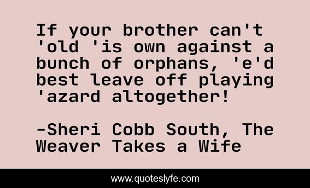 This page presents the quote "If your brother can't 'old 'is own against a bunch of orphans, 'e'd best leave off playing 'azard altogether!". Author of this quote is Sheri Cobb South, The Weaver Takes a Wife. This quote is about gambling, orphans, humour,.