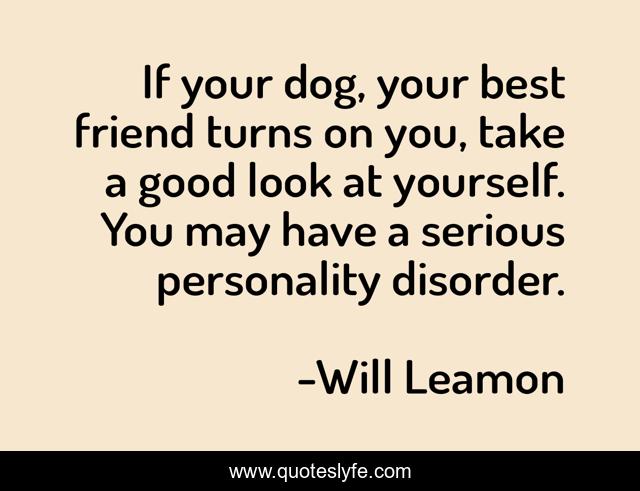 This page presents the quote "If your dog, your best friend turns on you, take a good look at yourself. You may have a serious personality disorder.". Author of this quote is Will Leamon. This quote is about friendship-true-and-loyal, dogs-loyalty, friend, personality,.