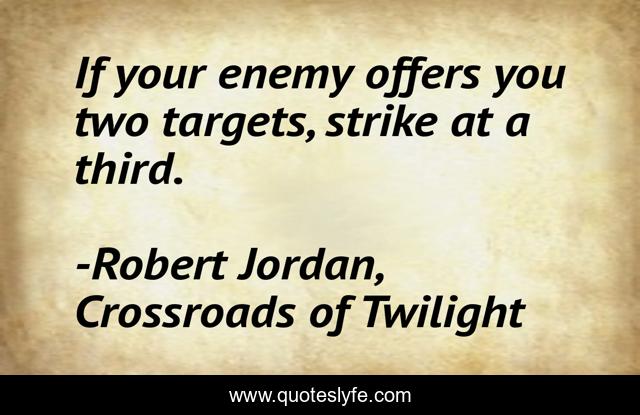 This page presents the quote "If your enemy offers you two targets, strike at a third.". Author of this quote is Robert Jordan, Crossroads of Twilight. This quote is about battle, adversary, war, adversaries, strategy,.
