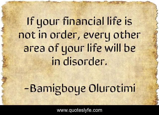 This page presents the quote "If your financial life is not in order, every other area of your life will be in disorder.". Author of this quote is Bamigboye Olurotimi. This quote is about life, financial, spiritual, area, problem, correction, solution, value, choice,.