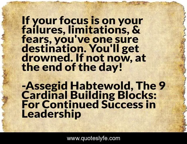 This page presents the quote "If your focus is on your failures, limitations, & fears, you've one sure destination. You'll get drowned. If not now, at the end of the day!". Author of this quote is Assegid Habtewold, The 9 Cardinal Building Blocks: For Continued Success in Leadership. This quote is about faith, courage, moving-on, hope,.