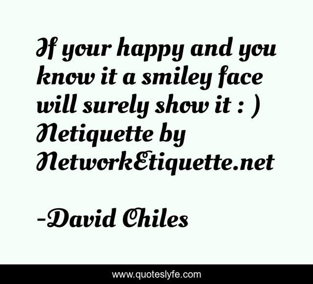 This page presents the quote "If your happy and you know it a smiley face will surely show it : ) Netiquette by NetworkEtiquette.net". Author of this quote is David Chiles. This quote is about social-media, internet-rap-records, smiley-face, digital-etiquette, internet-rap, internet-etiquette, smiley, email, netiquette,.