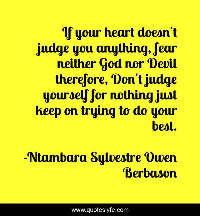This page presents the quote "If your heart doesn't judge you anything, fear neither God nor Devil therefore, Don't judge yourself for nothing just keep on trying to do your best.". Author of this quote is Ntambara Sylvestre Owen Berbason. This quote is about judgement, god, devil, heart,.