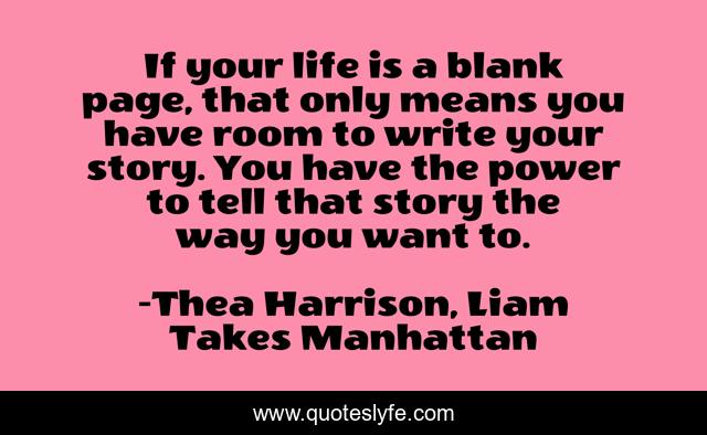 This page presents the quote "If your life is a blank page, that only means you have room to write your story. You have the power to tell that story the way you want to.". Author of this quote is Thea Harrison, Liam Takes Manhattan. This quote is about goddesses, paranormal, dragons, growing-up, puppies, teenage-rebellion,.