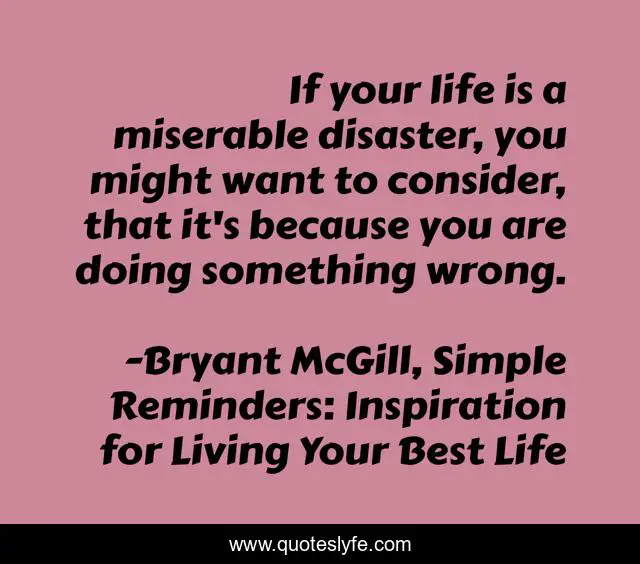This page presents the quote "If your life is a miserable disaster, you might want to consider, that it's because you are doing something wrong.". Author of this quote is Bryant McGill, Simple Reminders: Inspiration for Living Your Best Life. This quote is about consideration, life, disaster, misery,.