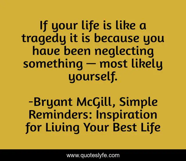 This page presents the quote "If your life is like a tragedy it is because you have been neglecting something — most likely yourself.". Author of this quote is Bryant McGill, Simple Reminders: Inspiration for Living Your Best Life. This quote is about life, neglect, tragedy,.