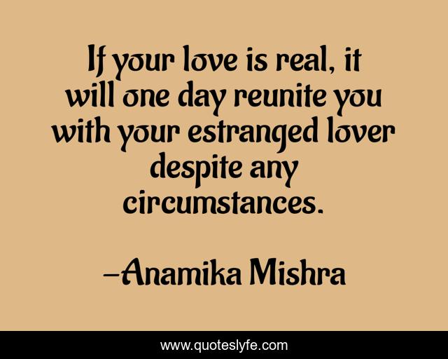 This page presents the quote "If your love is real, it will one day reunite you with your estranged lover despite any circumstances.". Author of this quote is Anamika Mishra. This quote is about true-love, love, real-love, affection,.