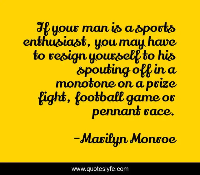 This page presents the quote "If your man is a sports enthusiast, you may have to resign yourself to his spouting off in a monotone on a prize fight, football game or pennant race.". Author of this quote is Marilyn Monroe. This quote is about football, man, yourself,.