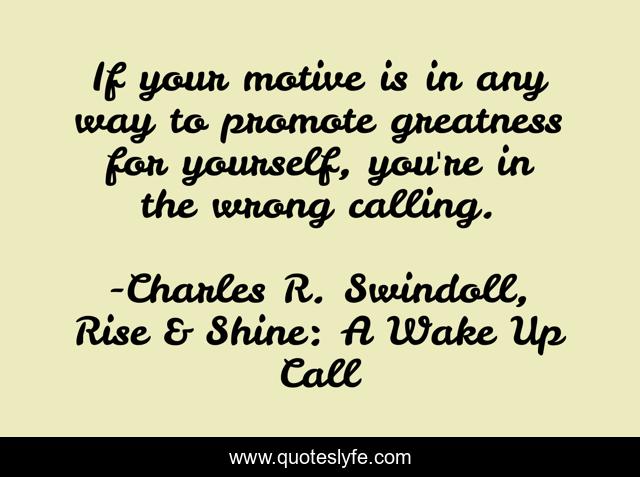 This page presents the quote "If your motive is in any way to promote greatness for yourself, you're in the wrong calling.". Author of this quote is Charles R. Swindoll, Rise & Shine: A Wake Up Call. This quote is about god, worship, church,.