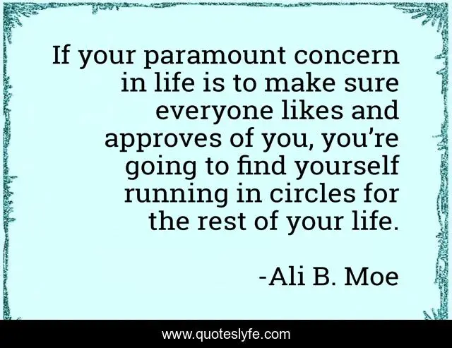 This page presents the quote "If your paramount concern in life is to make sure everyone likes and approves of you, you’re going to find yourself running in circles for the rest of your life.". Author of this quote is Ali B. Moe. This quote is about life, character, expectations,.
