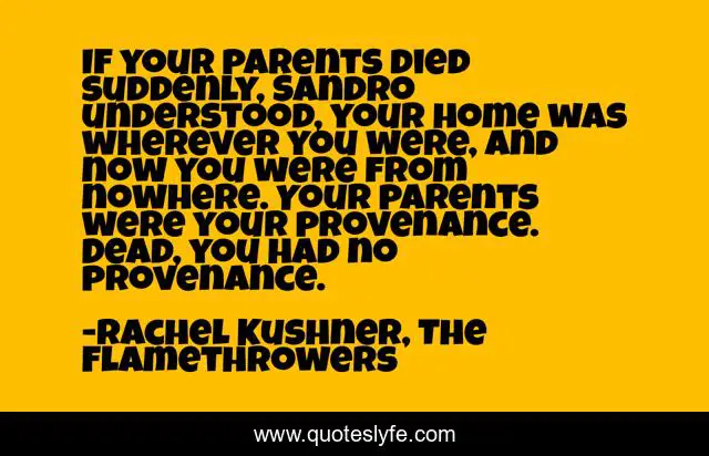 This page presents the quote "If your parents died suddenly, Sandro understood, your home was wherever you were, and now you were from nowhere. Your parents were your provenance. Dead, you had no provenance.". Author of this quote is Rachel Kushner, The Flamethrowers. This quote is about family, identity,.