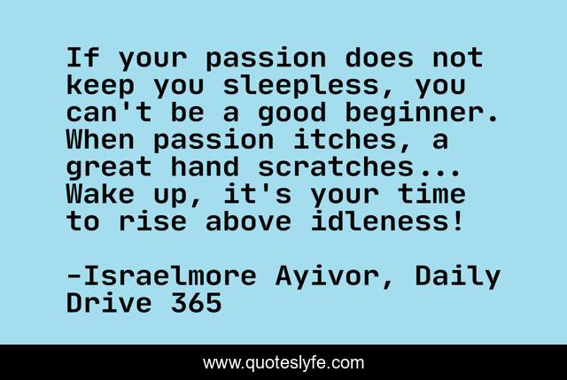 This page presents the quote "If your passion does not keep you sleepless, you can't be a good beginner. When passion itches, a great hand scratches... Wake up, it's your time to rise above idleness!". Author of this quote is Israelmore Ayivor, Daily Drive 365. This quote is about arise-and-shine, beginner, begin-now, actions, wake-up, sleep, arise, food-for-thought, idleness,.