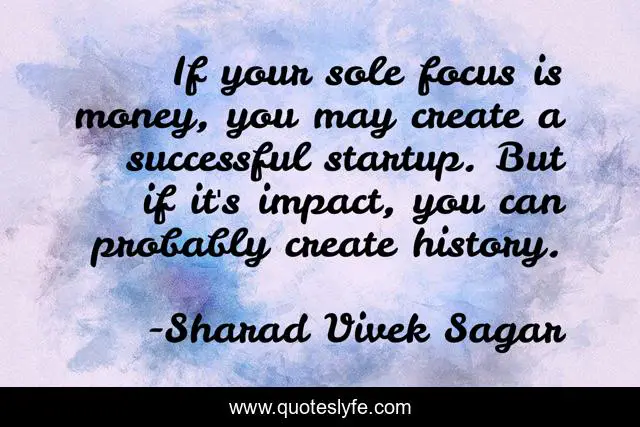 This page presents the quote "If your sole focus is money, you may create a successful startup. But if it's impact, you can probably create history.". Author of this quote is Sharad Vivek Sagar. This quote is about impact, success, money, create, sole, startup, focus, history,.
